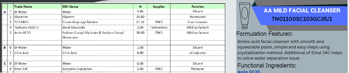 Amino acid facial cleanser with smooth and squeezable paste, simple and easy steps using crystallization method. Additional of Emul 34C helps to solve water separation issue.