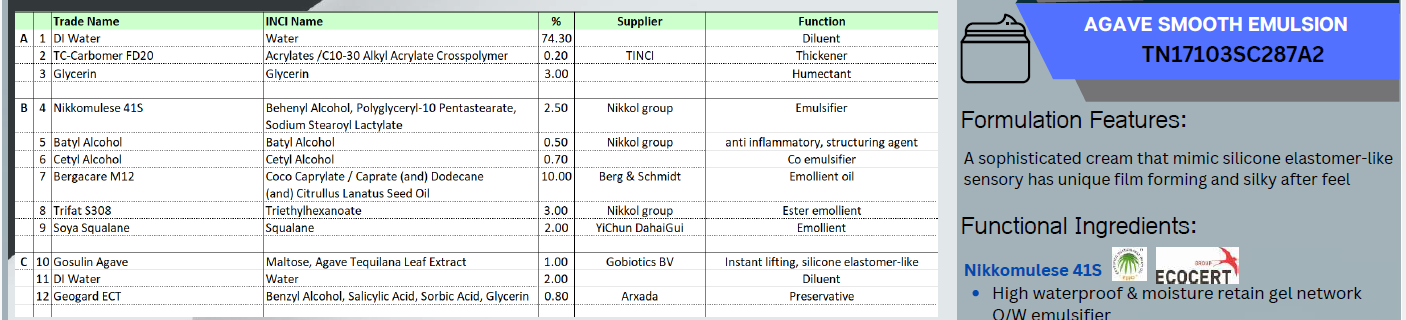 A lamellar type of emulsion gives moisture retaining gel network and delicate powdery feel, offers a matte finishing touch for overall face contour application. GOSULIN® AGAVE has the power to lift the skin immediately and reduced wrinkles.
