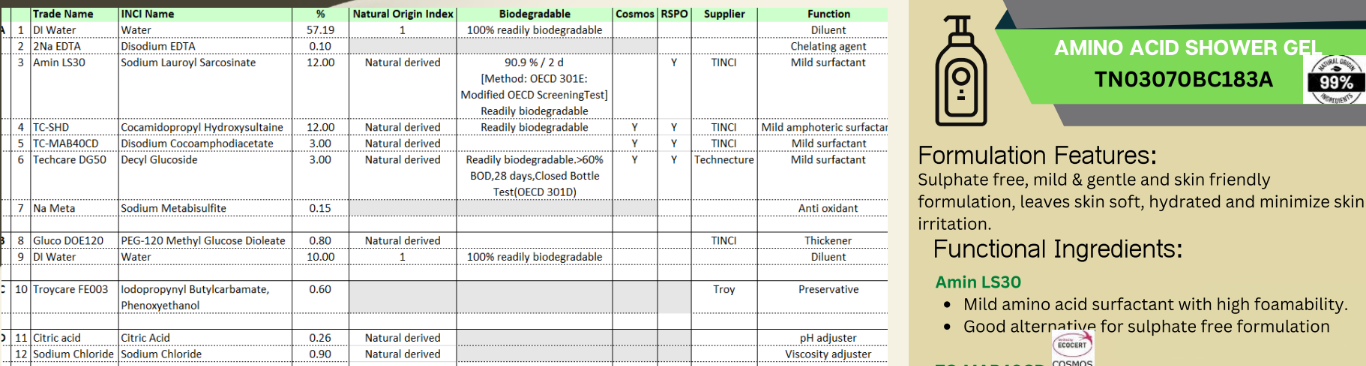 Warm ProcessFormulated with natural derived & RSPO certified ingredients, this mild and gentle transparent body wash gives fine and creamy lathering helps to cleanse dirt and excessive sebum without delipidation of stratum corneum.