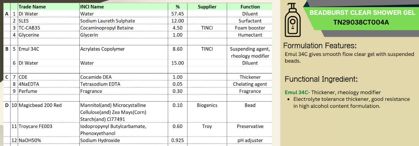 A smooth and long flow clear bath gel with suspended aesthetic visualize red beads breaking into transparent when spread on skin during shower time