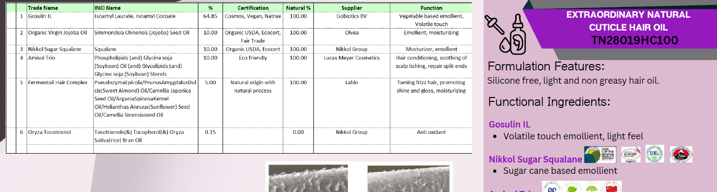 Silicone free, light and non greasy natural hair oil that improve hair hydrophobicity. Repairs hair cuticle and split-end while soothing scalp condition.