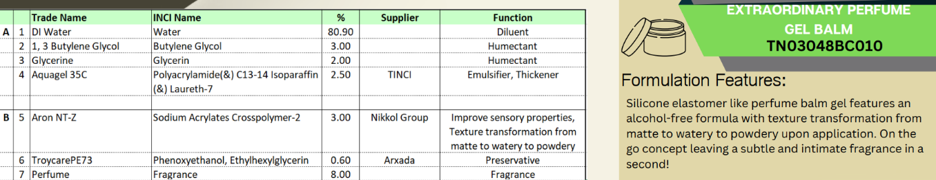 Silicone elastomer like perfume balm gel features an alcohol-free formula with texture transformation from matte to watery to powdery upon application. On the go concept leaving a subtle and intimate fragrance in a second!