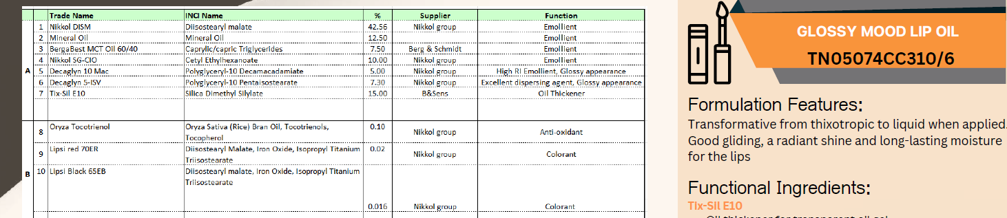 Transformative thixotropic rheology, from gel to liquid when applied. Good gliding, a radiant shine and long-lasting moisture for the lips