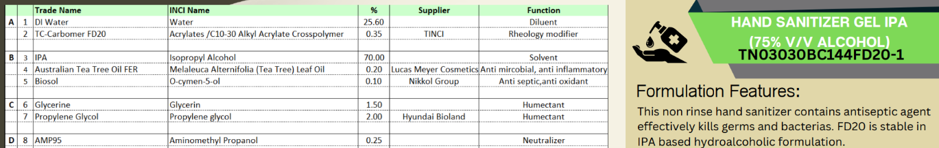 This non rinse hand sanitizer formulate with TC-Carbomer 381 thickener works with AMP to thicken translucent clear hydroalcoholic gel that contains high % IPA.