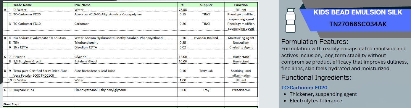 Formulation with readily encapsulated emulsion and actives inclusion, long term stability without compromise product efficacy that improves dullness, fine lines, skin feels hydrated and moisturized.