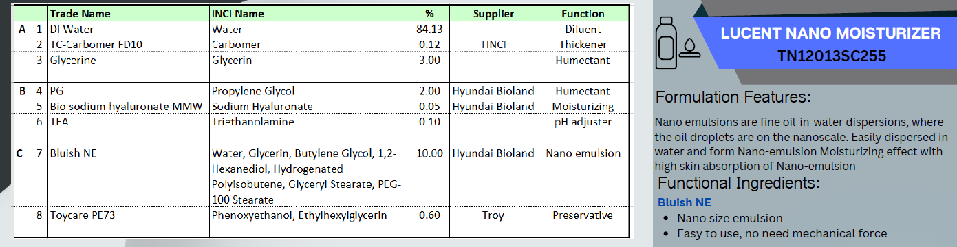Nano emulsions are fine oil-in-water dispersions, where the oil droplets are on the nanoscale. Easily dispersed in water and form Nano-emulsion moisturizing effect with high skin absorption of Nano-emulsion low energy manufacturing process possible