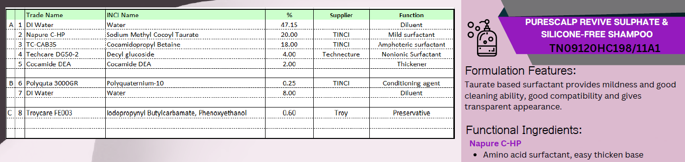 Taurate based surfactant provides mildness and good cleaning ability, good compatibility and gives transparent appearance. Formulated with high nitrogen content Polyquaternium-10 that can tolerates high salt content yet medium molecular weight that doesn’t causes build up