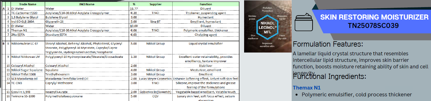 Nikkomulese LC forms lamellar LC structure, improves skin barrier function and boosts moisutre retaining ability of skin. Lecinol MFL as multifunctional active to promotes synthesis of ceramide and production of filaggrin towards strengthening skin barrier