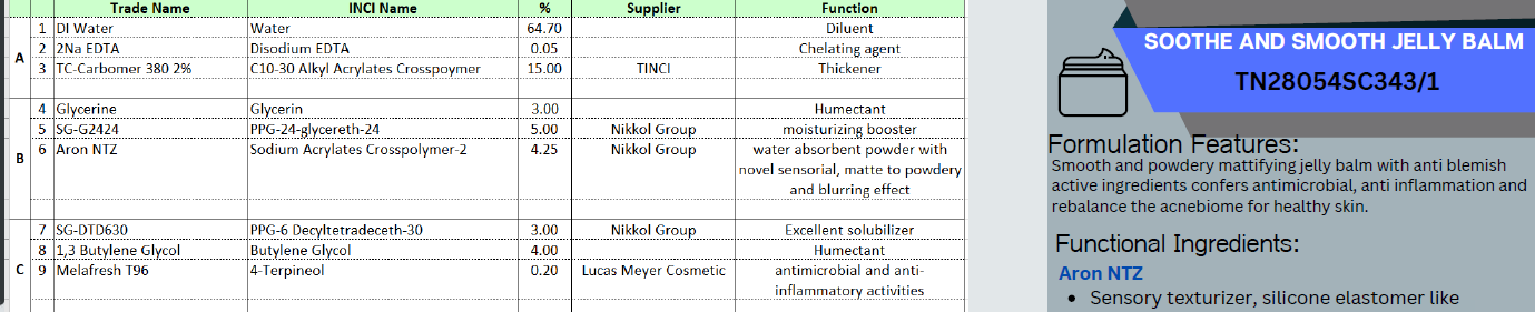 Smooth and powdery mattifying jelly balm with anti blemish active ingredients confers antimicrobial, anti inflammation and rebalance the acnebiome for healthy skin.