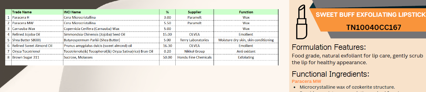 Pamper your lips with the luscious care of Brown Sugar Exfoliate Lipstick. Infused with natural brown sugar crystals, this unique formula gently exfoliates to remove dry, flaky skin, revealing soft, smooth lips. Packed with nourishing ingredients like shea butter andsweet almond oil, it hydrates and conditions while providing a hint of color for a fresh, radiant look.